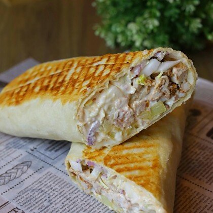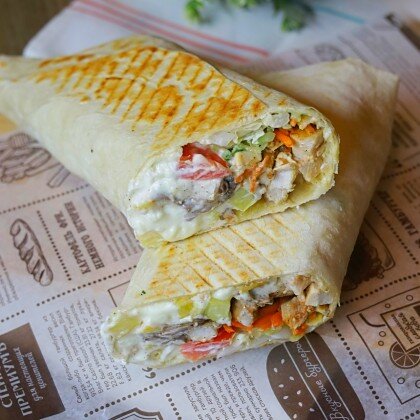 Лаваш, курица, сливочный соус, помидор, огурец, маринованный огурец, пекинская капуста, кр. лук Вес : 400 гр