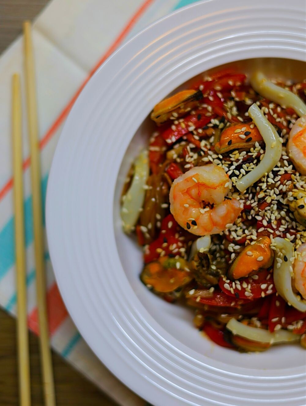 Лапша, креветки, болгарский перец, морковь, красный лук , соус Унаги , кунжут