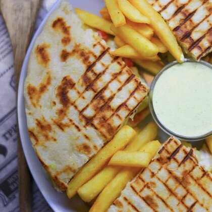 Жареное мясо , картофель фри , помидор , лепёшка Пита, соус «Хмели Сунели» Вес : 350 гр