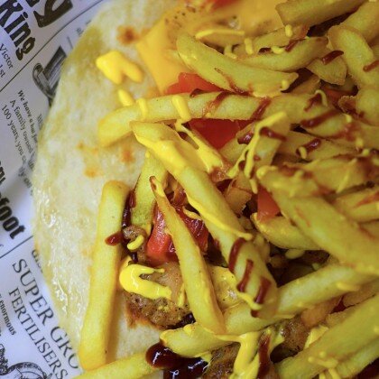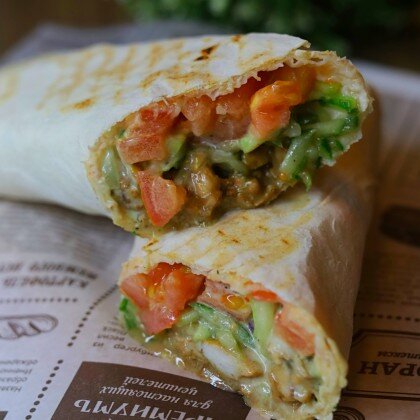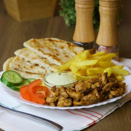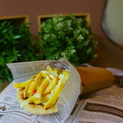 Жареное мясо , картофель фри, помидор , сыр «Моцарелла», соус «Хмели Сунели» , две лепешки Пита Вес : 650 гр